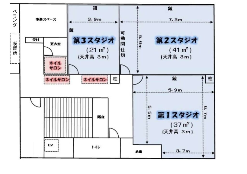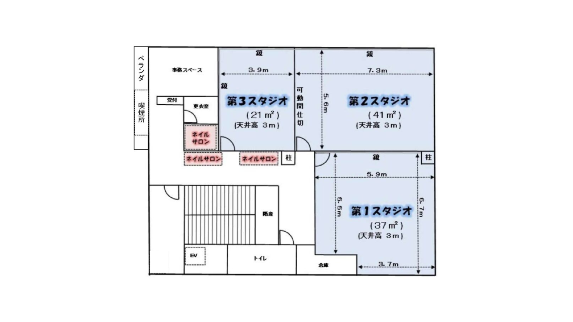 - 第2と第3スタジオは可動間仕切で、一体として使用可(第2と第3スタジオは、音漏れあります。)